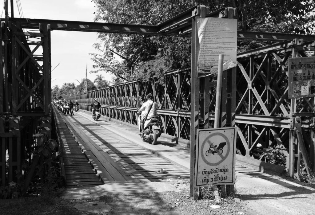 Une passerelle de fer tend ses bras au-dessus du sol, grinçante, tissée d’histoires et de trajectoires. Les motos glissent, silencieuses messagères du quotidien, entre croisement d’acier et éclats de lumière. Le panneau interdit les envolées insouciantes, mais les pensées voyagent librement. Sous la voûte végétale, ce pont devient un trait d’union, suspendu entre passé et