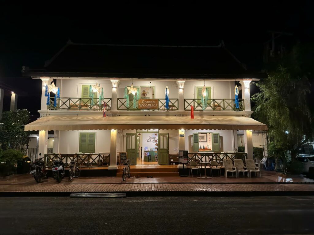Sous le voile de la nuit, la bâtisse coloniale s’illumine comme un havre suspendu dans le temps. Les balustrades ornées veillent, tandis que les lanternes dorées soufflent des murmures anciens à la brise nocturne. Chaque fenêtre entrouverte est une promesse de chaleur et d’échos lointains. La façade respire l’élégance tranquille, racontant des histoires muettes à