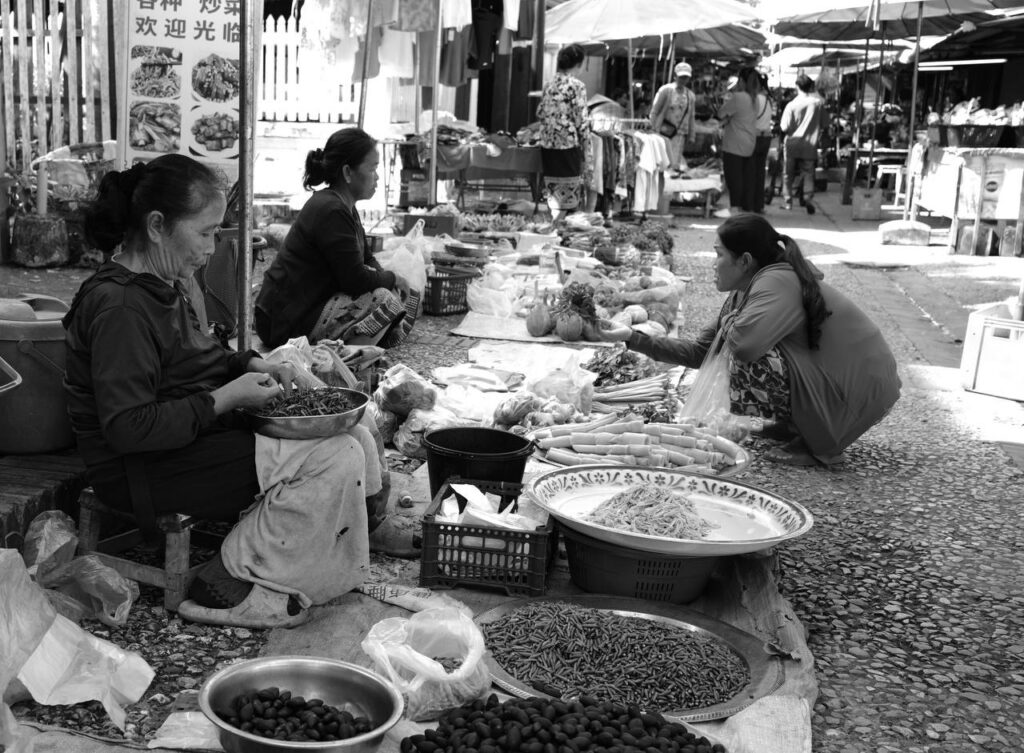 Sous un ciel d’ombre et de lumière, des femmes tissent la vie avec leurs mains remplies de saveurs et de gestes simples. Le marché s’étire comme une chanson tranquille, où chaque étal raconte une histoire muette. Les fruits de la terre reposent dans des paniers, dessinant des cercles de tradition. Les visages parlent sans mots,