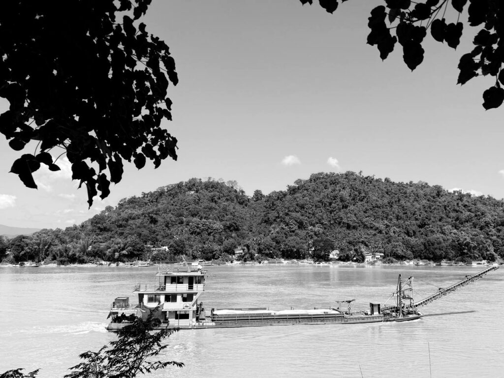 Une barge glisse, silencieuse et dévouée, sur le miroir tranquille d’un fleuve sans âge. En noir et blanc, le temps suspend son souffle, encadré de feuillages secrets. Les collines assoupies veillent, immobiles témoins des voyages discrets. L’eau, comme un ruban de soie, accompagne l’embarcation dans une danse lente, presque oubliée.