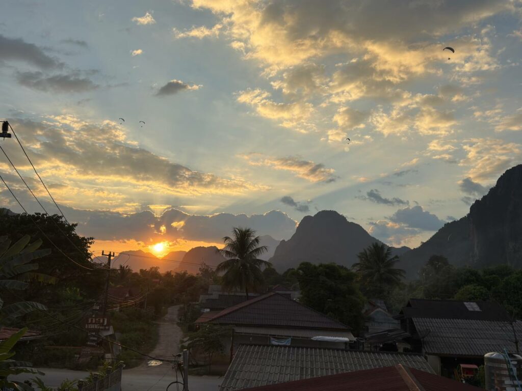 Le soleil perce l’horizon, éclaboussant les nuages d’or et de paix. Les montagnes veillent, sombres géants assoupis, tandis que les toits paisibles chuchotent les rêves de l’aube. Une palme solitaire s’élève, symbole de vie tranquille entre ciel et pierre. Des paramoteurs haut, témoins du couché du soleil. C’est un soir suspendu, où silence et lumière