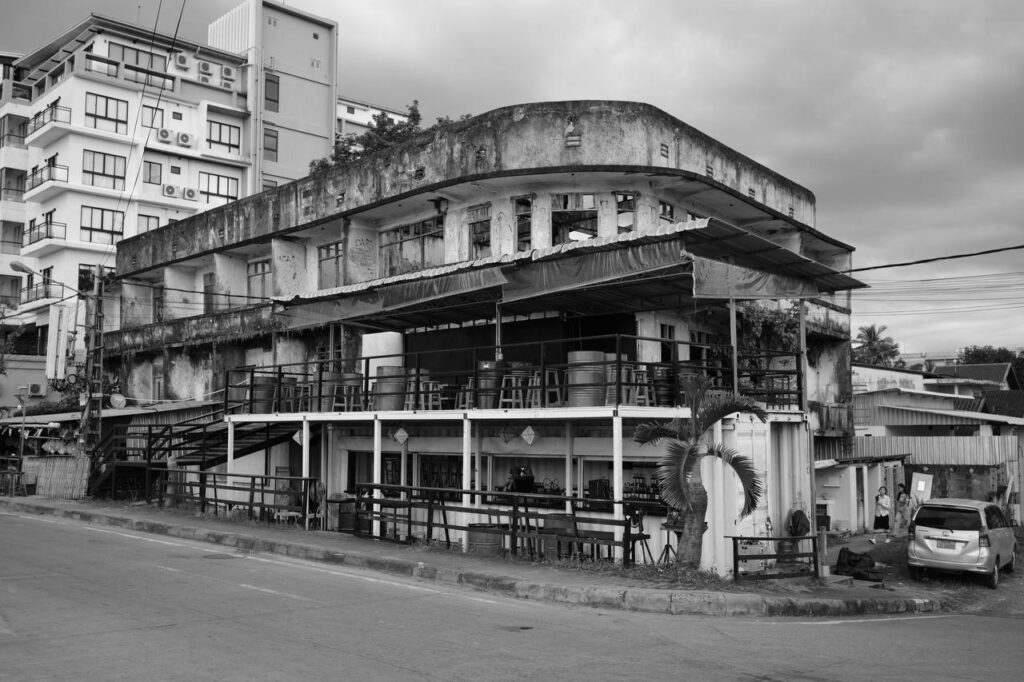 Sur le flanc d’une rue oubliée, s’élève un bâtiment en ruine que le temps effrite. Ses murs parlent en silence, racontant des histoires de rires perdus et de nuits vibrantes. En noir et blanc, il devient mémoire – entre ombres et lumière, entre abandon et persistance, le bar apparaît. Dans l’attente des premiers clients, les