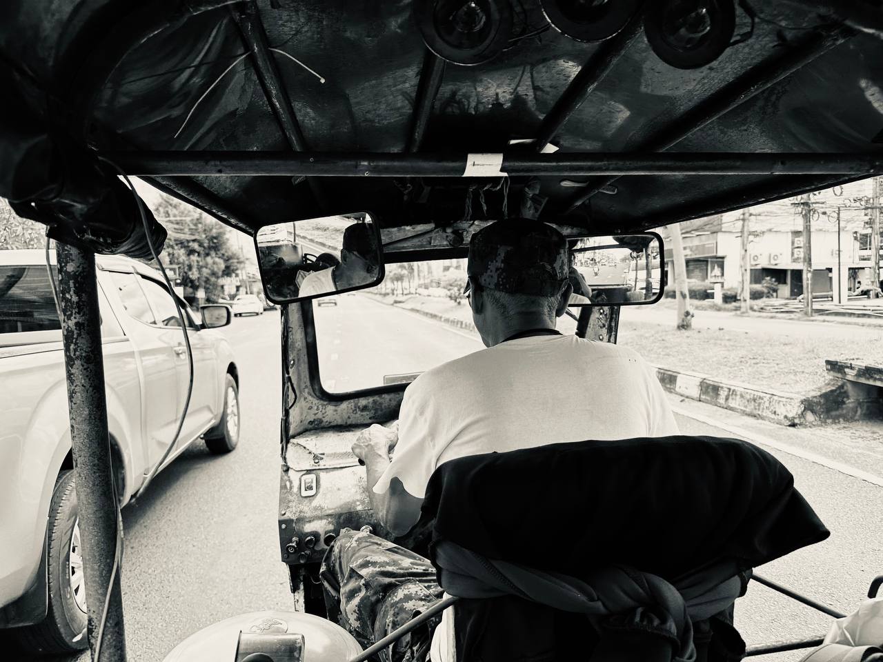 Au cœur d’un labyrinthe urbain, Ubon Ratchathani dans la fin fond de la Thaïlande, un homme gouverne son navire de fer et de rouille, défiant le bitume avec la «sagesse des routes ». Sous le toit cabossé d’un tuk-tuk, il trace son chemin entre les ombres du passé et la lumière du jour. Chaque vibration du moteur fredonne une chanson de liberté, chaque carrefour devient un poème en mouvement. Le monde défile comme un vieux film en noir et blanc, mais lui, éternel voyageur, peint la ville avec le bruit de ses roues et l’invisible promesse d’ailleurs.