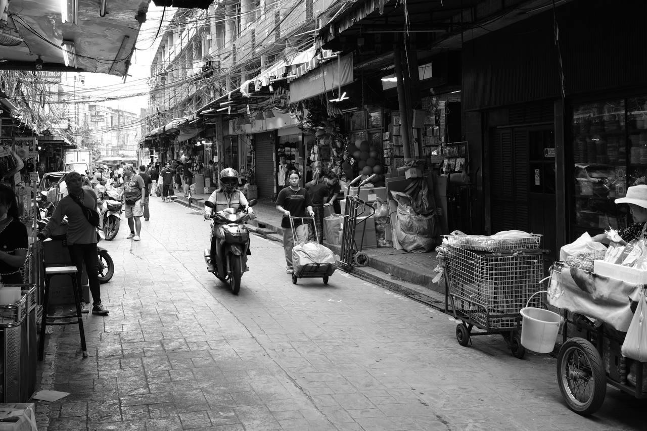 Dans l’effervescence d’une ruelle, le noir et blanc capture une chorégraphie urbaine. Scooters tracent leur chemin comme des flèches dans le vent, tandis que les âmes laborieuses, chariots à la main, tissent la trame quotidienne. Poussière, regards et commerce se fondent dans une cadence familière. Une harmonie rugueuse, battue par le tumulte, mais portée par l’élan des vies anonymes.