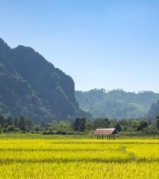 Un champ doré murmure sous le regard silencieux des montagnes. Le ciel d’azur caresse les pics rocheux, drapés d’émeraudes, dans une danse immobile. La nature respire, généreuse, offrant un tableau de quiétude où le tempsÉtreinte de Jade et d’Or
