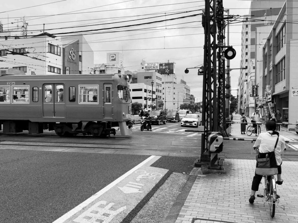 Dans un monde en noir et blanc, un train rouge franchit lentement le carrefour, comme un souffle de nostalgie dans une ville en mouvement. Les ombres s’étirent, les lignes s’entrelacent, et une silhouette à vélo scrute l’horizon. La scène, figée dans le temps, évoque une danse silencieuse entre le passé et le présent, où chaque bruit raconte une histoire et chaque pavé témoigne d’un rêve éveillé. Le ciel chargé de promesses murmure des secrets, tandis que la vie pulse autour de ce point de rencontre éphémère.