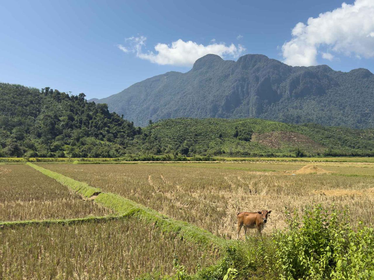 Un paysage rural se dévoile sous un ciel azur, couronné de montagnes émeraude qui veillent sur la plaine. Les rizières, parsemées de chaume doré après la récolte, offrent un tableau de textures terreuses. Une vache solitaire, gardienne silencieuse des lieux, broute paisiblement, ajoutant une touche de vie à cette scène bucolique où le temps semble suspendu.