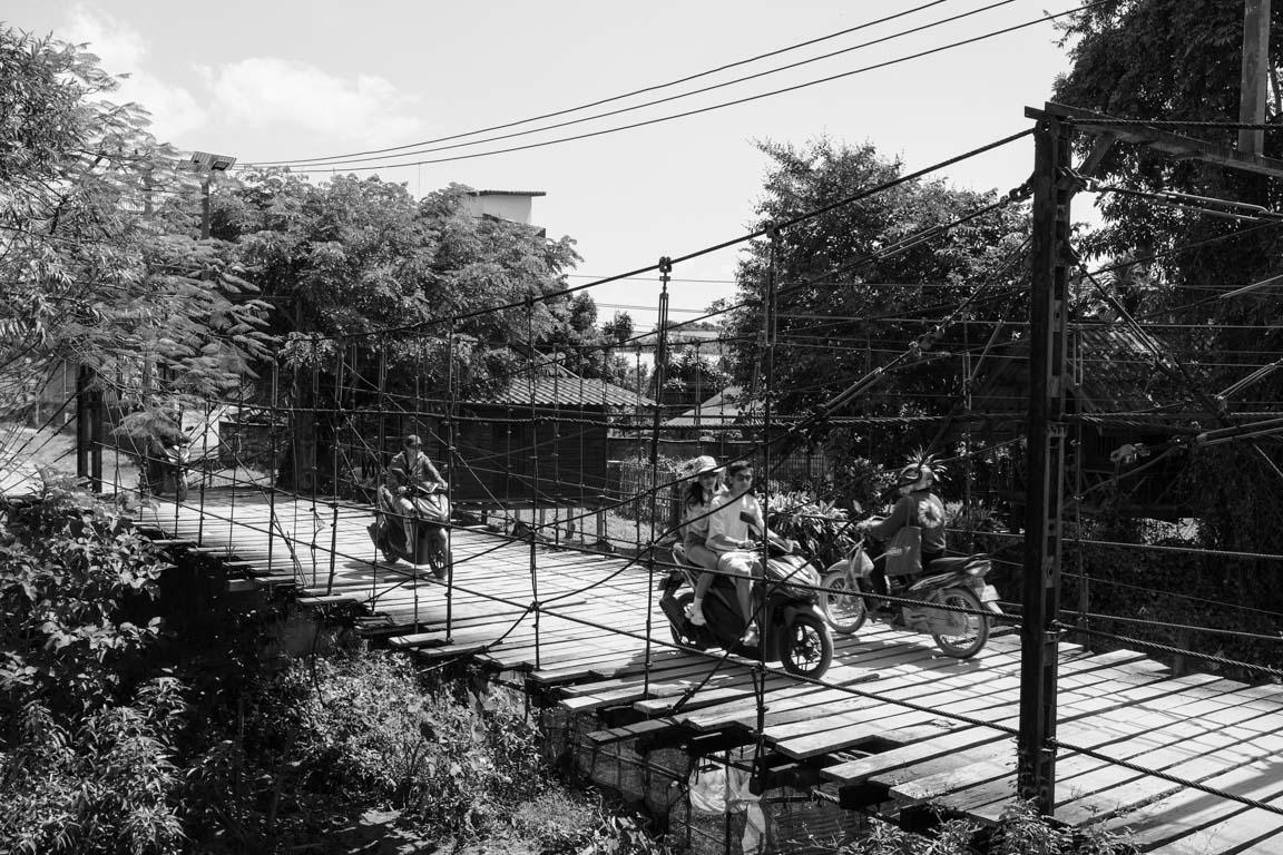 Un pont suspendu, fragile et gracieux, se dresse comme un fil ténu entre deux mondes verdoyants. Des silhouettes à deux roues le défient, courant après un horizon imprégné de lumière. Le bois craque sous leurs pas mécaniques, une mélodie éphémère au cœur d’un paysage figé dans le temps. Le noir et blanc révèle l’âme brute de cette scène, un tableau où l’équilibre précaire rencontre l’élan vital.